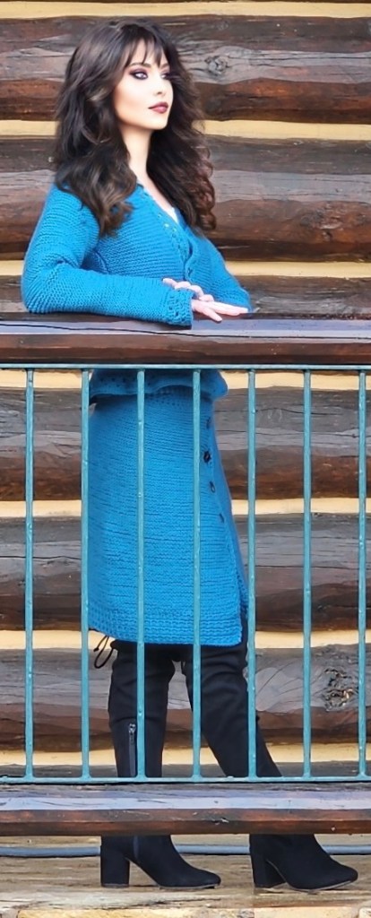 Hand knit teal dress to wear for business or to look nice in the city. Made from 100% polyester yarn, dry clean or wash in cold water and hang to dry. $100 Set includes sleeveless shirt, cardigan, and skirt.