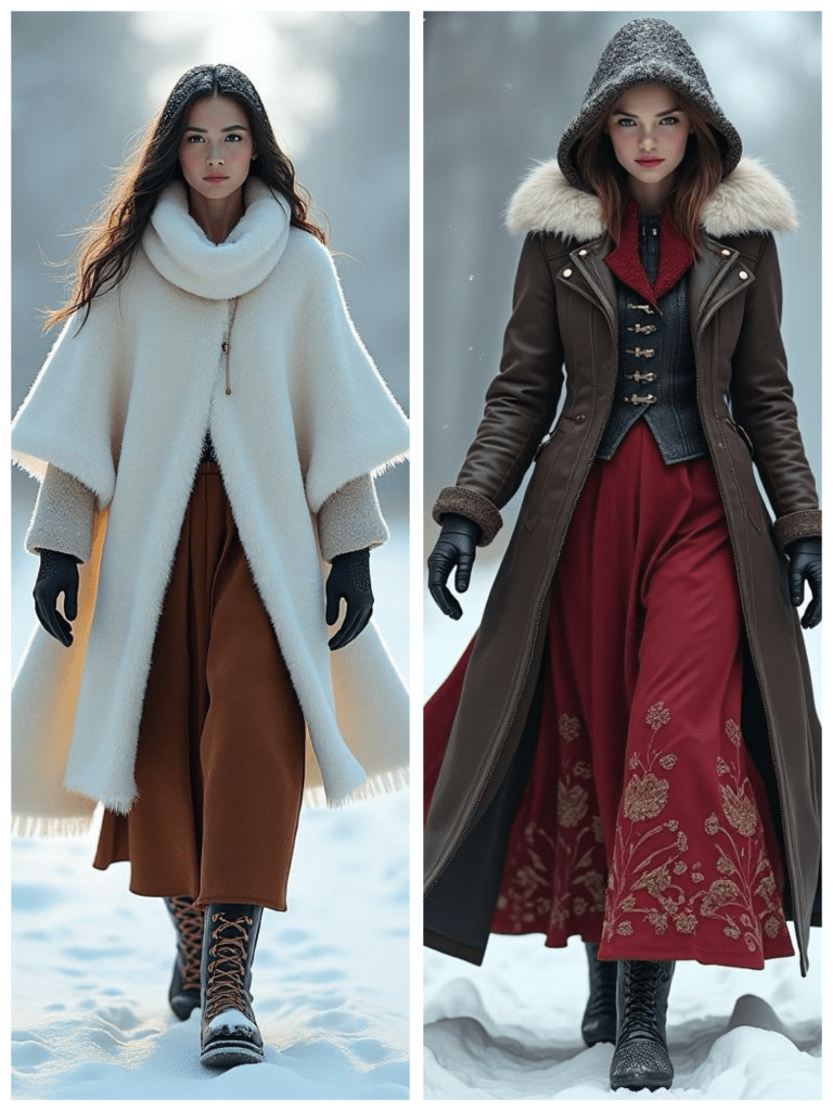 When it comes to Yuletide outfits, think flowing skirts with delicate lace and embroidery, tunic tops adorned with intricate designs inspired by Celtic art, and thick knit sweaters featuring winter motifs that evoke a sense of magic and wonder. Embrace the allure of ponchos, capes, and long coats trimmed with faux fur or donning a cozy hood, enveloping you in comfort and mystery as you wander through the winter wonderland.